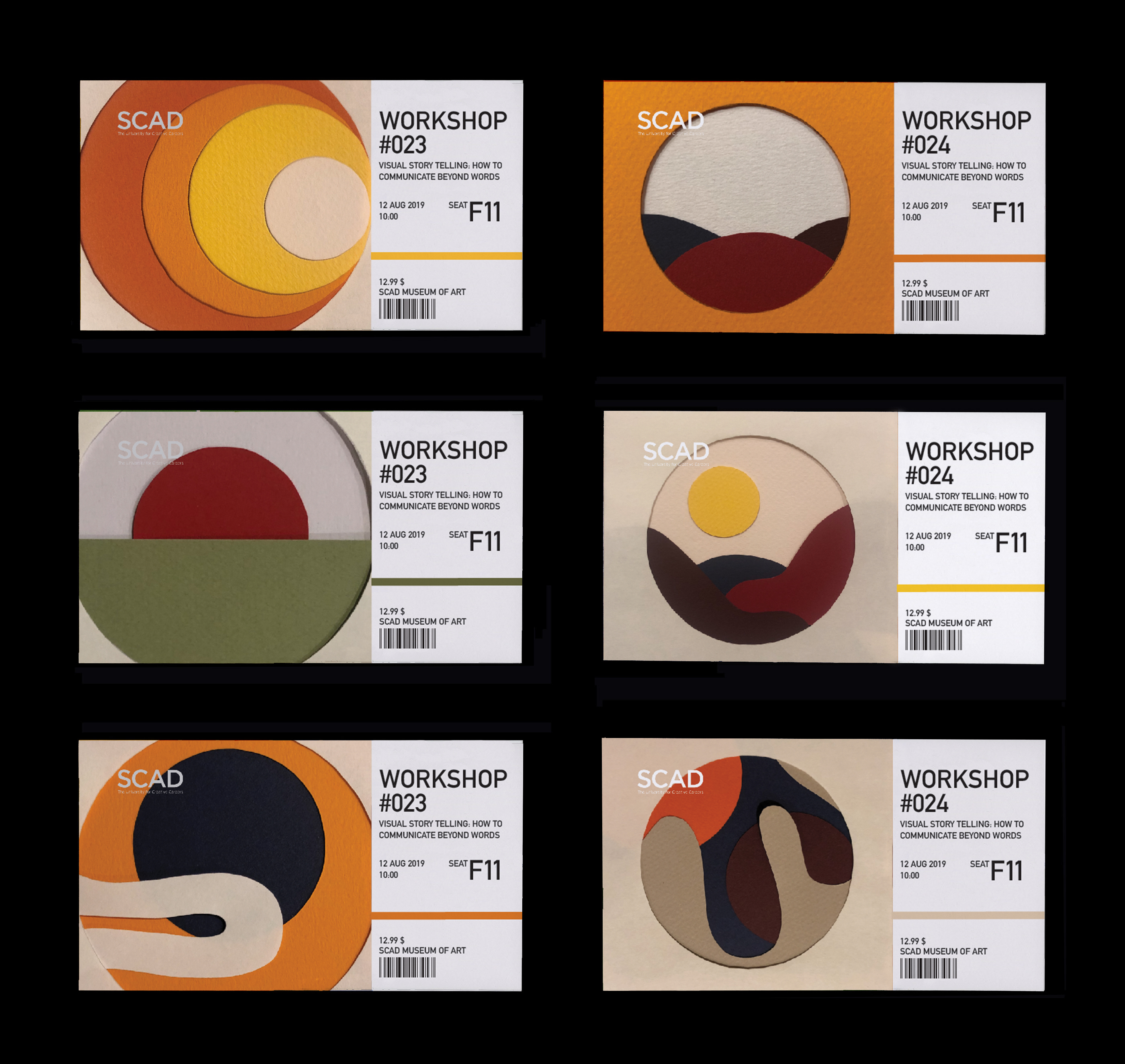 For SCAD’s annual workshop (conducted monthly), I was asked to develop a visual system for their physical tickets and merchandising. This series was meant to represent the changing seasons the tickets were meant to be used for, while using a practical method, actual collages that were then scanned and layed out for the ticket.